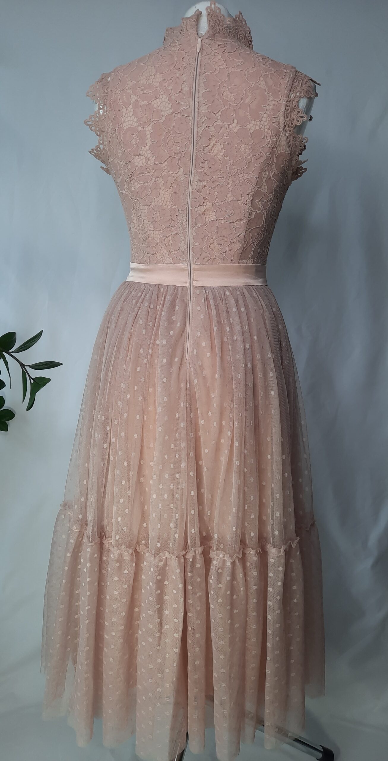 Długa tiulowa sukienka Amelia – to dopasowana góra z elastycznej koronki wysokiego gatunku z okrągłym dekoltem i kołnierzem stojącym oraz błyskawicznym krytym zamkiem z tyłu. Podkreśla biust, zapewniając obłędne wyróżnienie sylwetki.