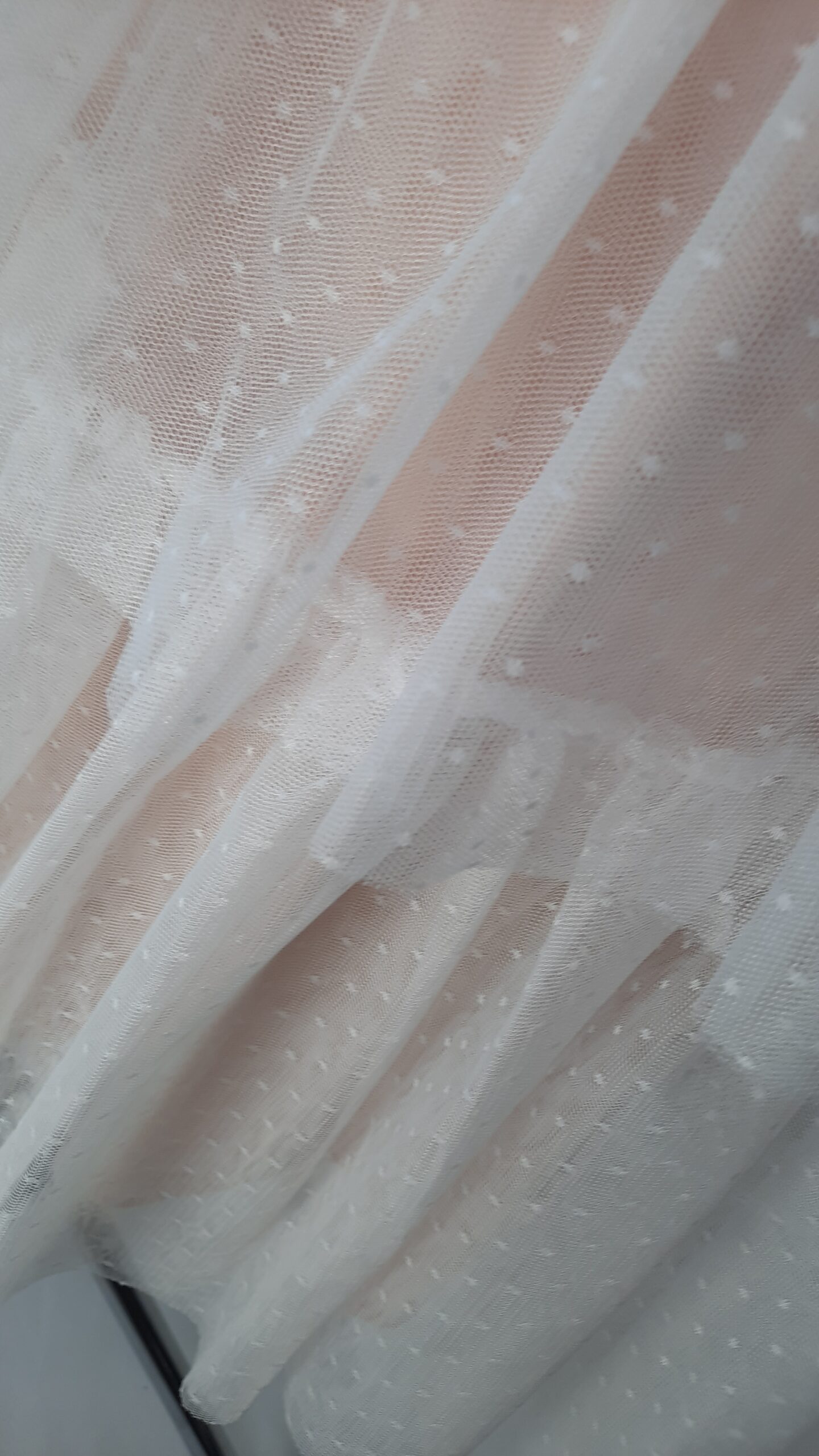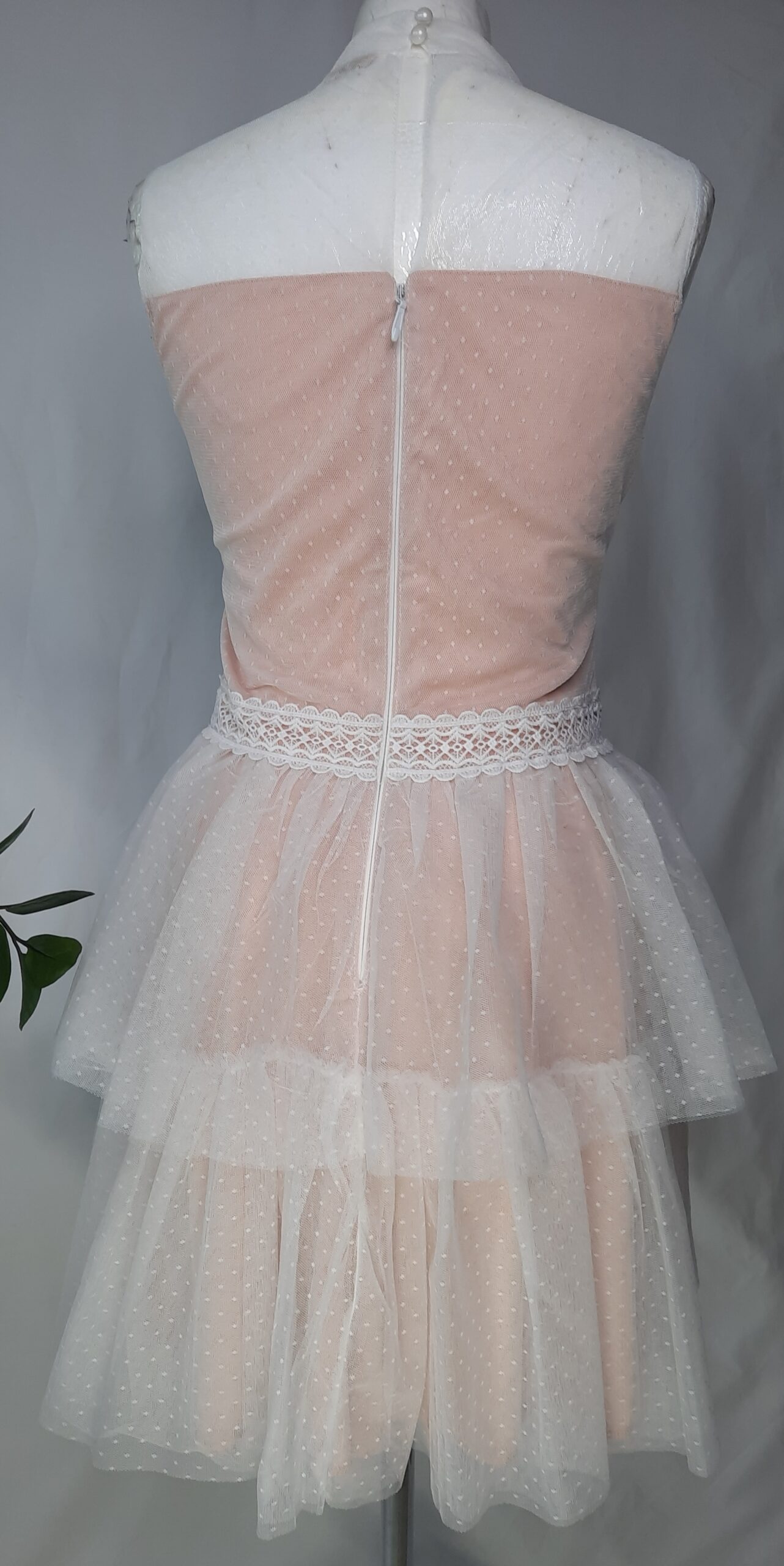 Krótka tiulowa sukienka ma romantyczny charakter dzięki swoim falbanom. Wykonana jest z delikatnego tiulu w drobne groszki z gorsetem dekorowanym białą taśmą koronkowa, który dodaje jej lekkości i niezwykłego uroku. Falbanki ozdabiają dół , tworząc efektowny wzór, który zdobi całą powierzchnię sukienki.