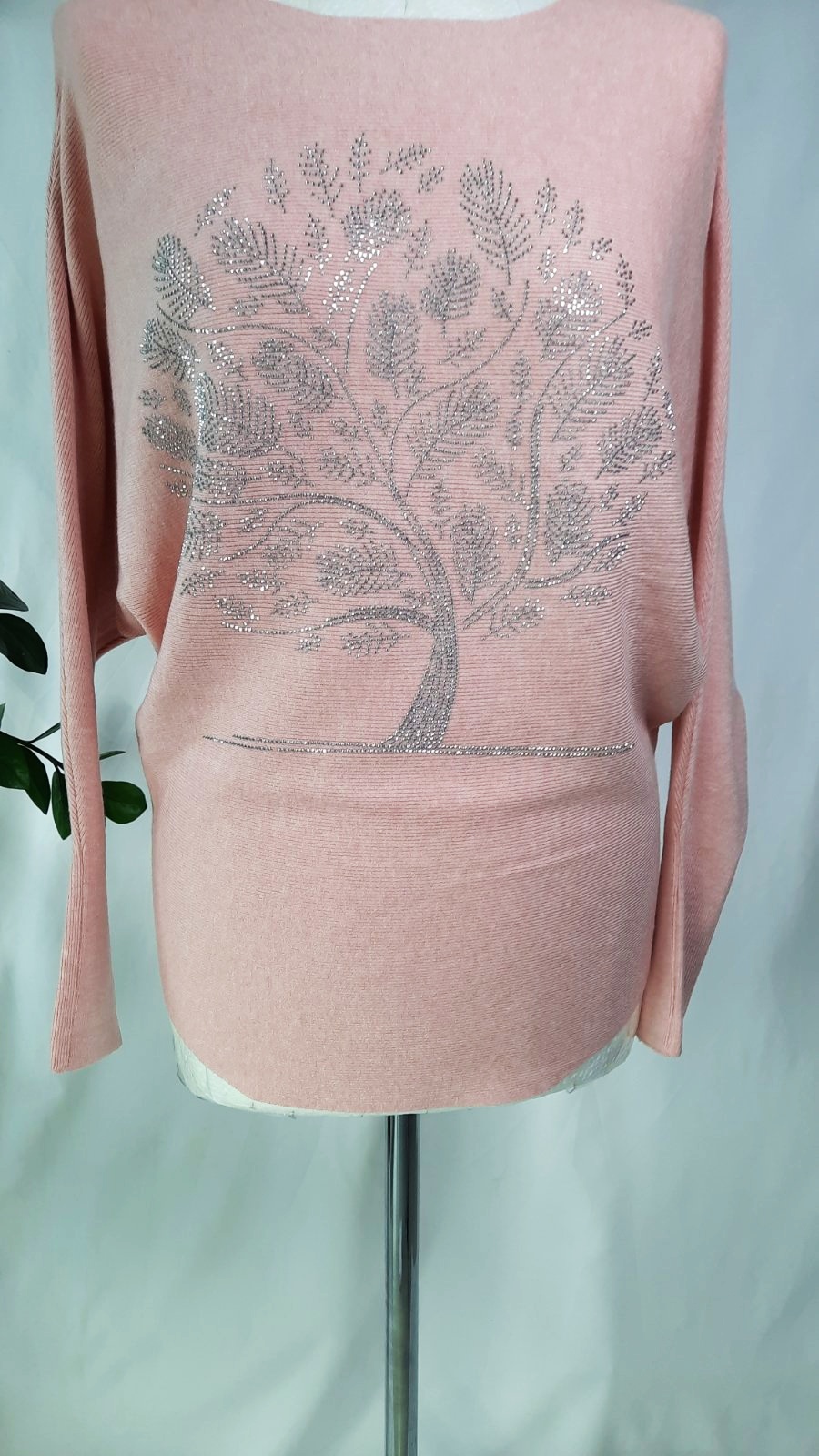 Na przodzie swetra znajduje się nadruk „drzewo” wykonany z kamienia, co nadaje mu unikalny  wygląd.